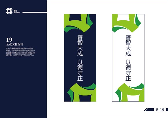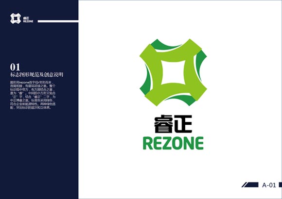 圖形用rezone首字母r變形而來,首尾相接,有循環(huán)延續(xù)之意。整個(gè)標(biāo)識弧中帶方,有方圓結(jié)臺之意,是為“睿”。中間的小方形又貼合 “正”字,結(jié)合“睿正”二字,為中正博睿之意。標(biāo)準(zhǔn)色采用綠色,符合企業(yè)新能源特性。兩種綠色搭配,突出標(biāo)識的層次和立體感。