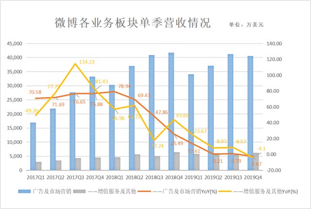 分業(yè)務(wù)來看,微博的營收來源主要來自:廣告和市場營銷收入、增值服務(wù)。廣告及市場營銷板塊是微博的營收大頭,2019年全年廣告和營銷營收15.3億美元,占公司總體營收的比例為86.44%,較2018年的15.0億美元增長2%,來自大客戶和中小企業(yè)的廣告和營銷營收為14.3億美元,較2018年的13.8億美元增長4%。增值服務(wù)包含會(huì)員與直播業(yè)務(wù),2019年全年微博增值服務(wù)營收為2.367億美元,較2018年的2.193億美元增長8%,其增長主要得益于2018年第四季度收購的直播業(yè)務(wù)所產(chǎn)生的營收。