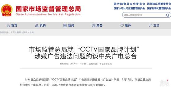 2019年1月17日,國家市場監(jiān)督管理總局針對“CCTV國家品牌計劃”廣告用語涉嫌違反《廣告法》問題約談中央廣電總臺,并責(zé)成北京市市場監(jiān)管局依法立案調(diào)查。