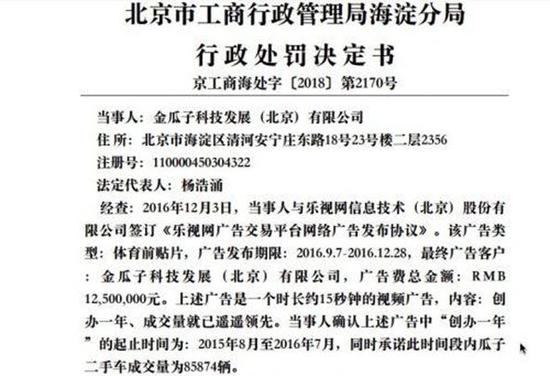 2018年11月15日,金瓜子科技發(fā)展(北京)有限公司因在廣告中使用瓜子二手車“創(chuàng)辦一年、成交量就已遙遙領(lǐng)先”的不實(shí)宣傳語,被罰款1250萬元。