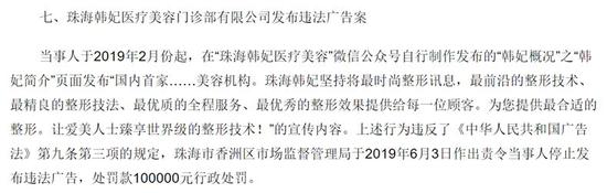 2019年,珠海韓妃醫(yī)療美容門診部有限公司發(fā)布包含“國內(nèi)首家”、“最前沿的整形技術(shù)、最精良的整形技法、最優(yōu)秀的整形效果”、“世界級的整形技術(shù)”的宣傳內(nèi)容,被罰款10萬元。