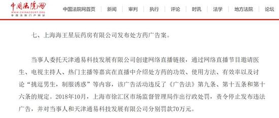 2018年6月15日,上海海王星辰藥房有限公司因開展“有球必硬夜夜激情”網(wǎng)絡(luò)直播活動,被依法處罰款70萬元。