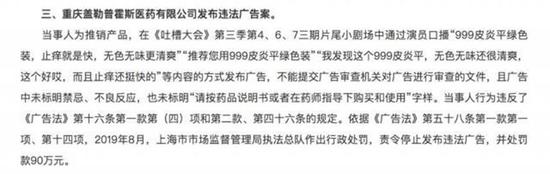 2019年12月17日,999皮炎平因在《吐槽大會》第三季第4、6、7三期片尾小劇場中通過演員口播廣告,但未標(biāo)明禁忌、不良反應(yīng),也未標(biāo)明“請按藥品說明書或者在藥師指導(dǎo)下購買和使用”字樣,被罰款90萬元。