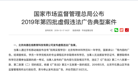 北京尚德在線教育科技有限公司在廣告中宣稱“一年學(xué)完,國家承認(rèn)”,實(shí)際無法頒發(fā)學(xué)歷證書,被罰款27.93萬元。