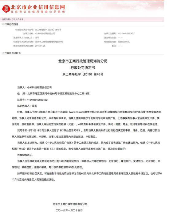 2016年1月25日,小米公司在官網(wǎng)出現(xiàn)“小米4C手機(jī)邊緣觸控已申請46項(xiàng)專利的”文字宣傳,但其實(shí)專利沒拿到,被處以3萬元罰款。