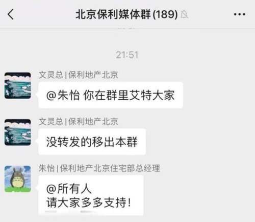 8月22日,關(guān)于“北京保利媒體群”的聊天記錄截圖在網(wǎng)上熱傳。起因是8月21日晚間,保利發(fā)展控股北京公司副總經(jīng)理文靈在媒體群里,命令其下屬在群里艾特所有媒體,轉(zhuǎn)發(fā)保利北京準(zhǔn)備在8月25日召開品牌發(fā)布會的前宣資料,并明確要求:“沒轉(zhuǎn)發(fā)的移出本群”。