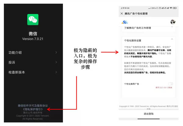 此前,上海市消保委在報(bào)告指出,微信App不僅隱私政策規(guī)則冗長(zhǎng)復(fù)雜,而個(gè)性化廣告推薦關(guān)閉入口不僅極其隱蔽,并且關(guān)閉流程設(shè)置繁瑣。